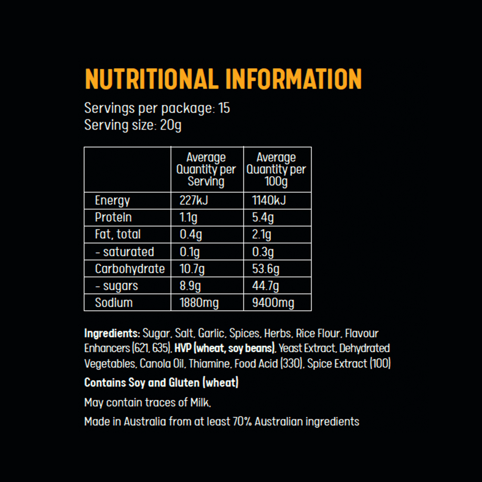 Classic BBQ chook flavour with subtle paprika warmth and a hint of cayenne. Rounded out with onion and herbs, it’s perfect for whole birds, wings or juicy thighs.